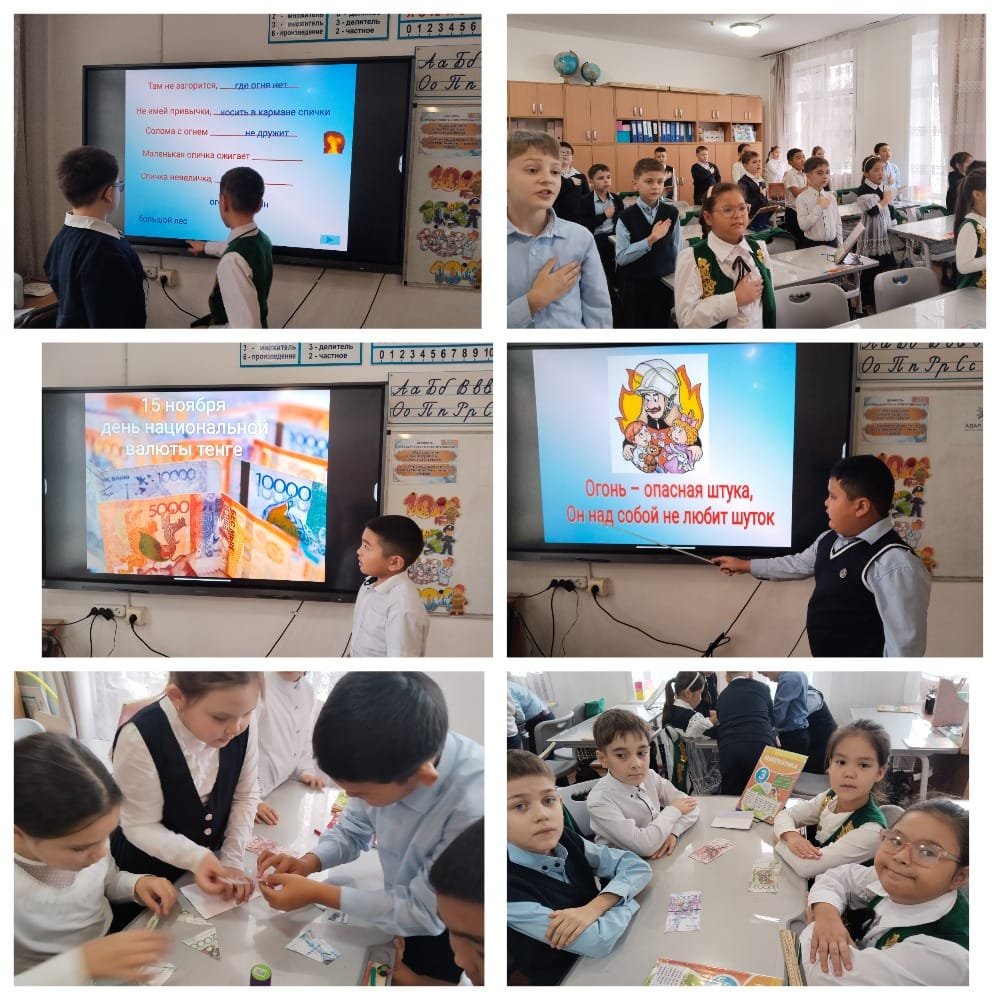 3 «Б» күнін «Ұлттық валюта күніне» арналған сынып сағатынан бастады. Бұл іс-шара ерте жастан бастап қаржылық сауаттылықты дамытуға бағытталған. Сабақ барысында оқушылар: мемлекеттіліктің символы ретінде ұлттық валютаның маңыздылығын білді; ақша белгілерінің тарихымен және оларды өндіру процесімен танысты; ақшаға ұқыпты қараудың және өзіміздің аз шығынымызды жоспарлауды үйренудің қаншалықты маңызды екенін талқылады. Сынып сағаты ойын және викторина элементтерімен интерактивті түрде өтті, бұл тіпті ең күрделі ұғымдарды түсінікті және есте қаларлық етуге мүмкіндік берді. Сондай-ақ, сынып сағатының бір бөлігі «Өрт қауіпсіздігі» тақырыбына арналды. Жеке қауіпсіздік сабағы аясында балалар қауіп төнген жағдайда қалай әрекет ету керектігін қайталады.