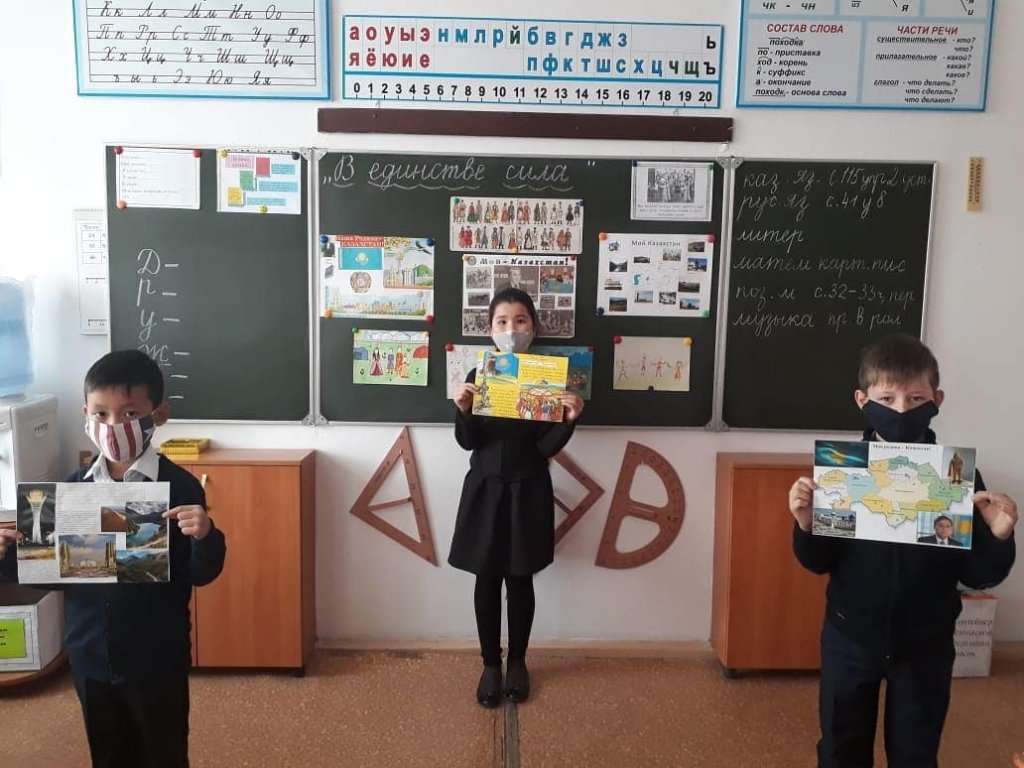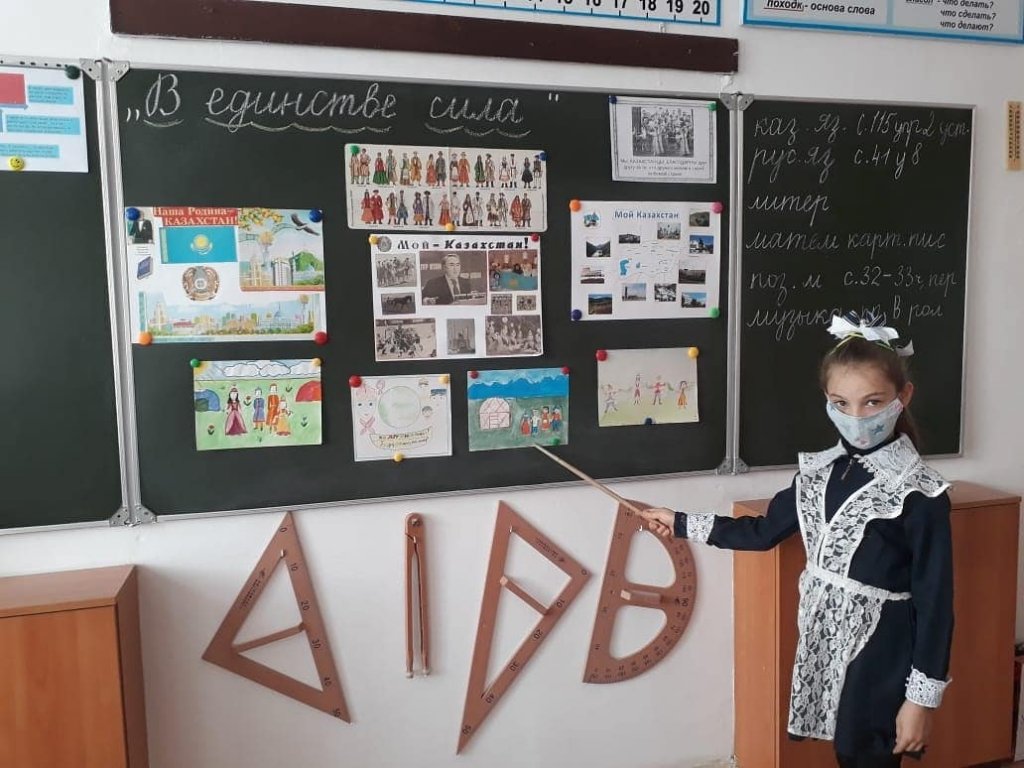 Қазақтың нақыл сөзінде айтылғандай: «Құстың күші - қанатында, ал ер адам - достықта». Мектеп сағаты кезінде балалар жұмбақтар тапты, достық сөзі үшін ассоциацияларды алды, мақал-мәтелдермен жұмыс жасады. Біздің Қазақстан - көпұлтты мемлекет, біз өз еліміздің тұрғындары бейбітшілікте, достықта және келісімде өмір сүреміз, өйткені біздің күшіміз бірлікте!
